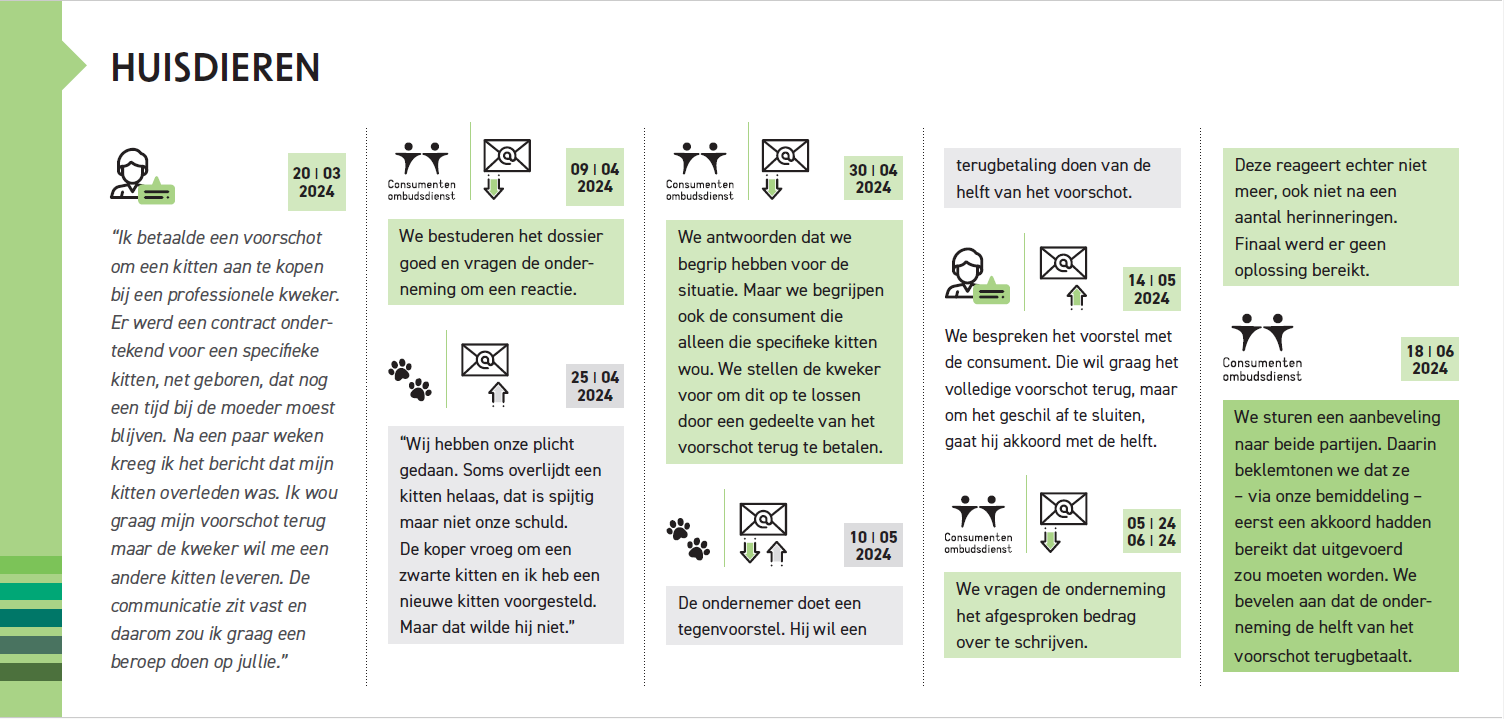 Voor de Consumentenombudsdienst begint alles wanneer een consument ons contacteert met een klacht. Maar voor de consument, in dit geval Gabriella (fictieve naam), begon het allemaal toen ze besloot een kat te kopen bij een professionele fokker. Na wat tijd doorgebracht te hebben met de jonge katjes, viel haar keuze op een zwart kitten. Aangezien het diertje nog te jong was om mee te nemen, moest het nog een tijdje bij de moeder blijven. Gabriella betaalde alvast een voorschot, terwijl de fokker voor het kitten zorgde tot het moment van afhalen.